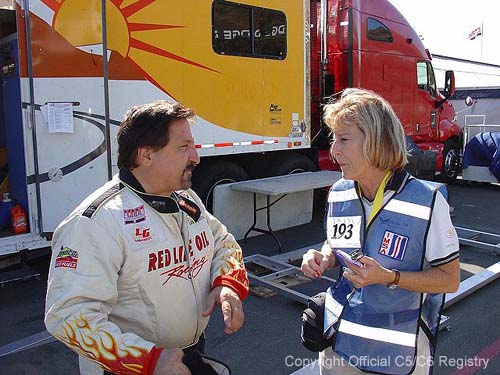 Registry reporter Janet Curran chats with Speed GT winner Lou Gigliotti. |