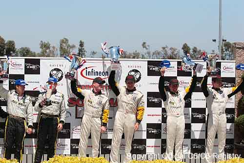 O'Connel and Ron Fellows celebrate their win on the podium.